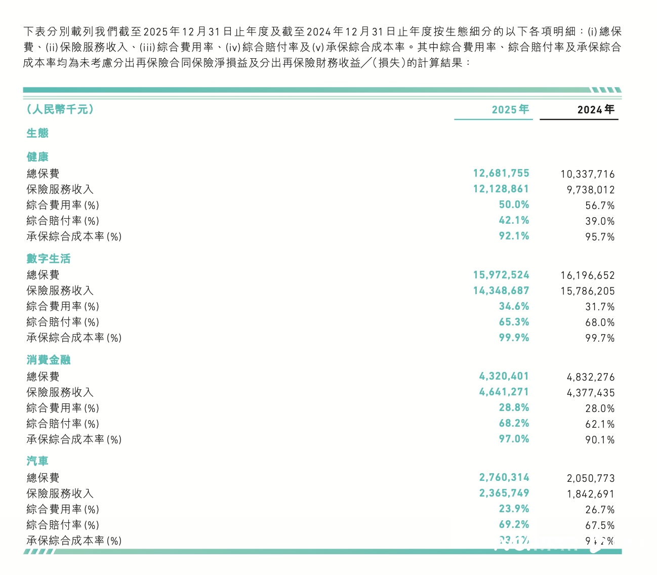 康健生态成为首要增长(chang)极,2025年完成总保(bao)费126.82亿元,同比增长(chang)22.7%;完成保(bao)险服务收入121.29亿元,同比增长(chang)24.6%;承保(bao)综合本钱(qian)率为92.1%,较2024年同期下降3.6个百分点,其中综合用度率为50%,较2024年同期下降6.7个百分点,综合赔付率为42.1%,较2024年同期上升3.1个百分点,首要因为产物(wu)结构(gou)的变化。众安正在线指出,“尊享e生+众民保(bao)”双品牌矩阵成效(xiao)明显,其中众民保(bao)系列(lie)2025年完成总保(bao)费人民币21.7亿元,同比增长(chang)456.1%。