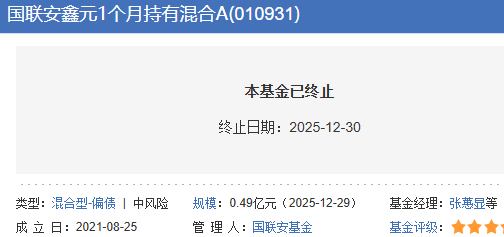 报告称,国联安鑫元1个(ge)月持有期混合型(xing)证券投资基金基金合同于2021年8月25日生效。根据《中华人民(min)共和国证券投资基金法》、《公然募集证券投资基金运作管理办法》等(deng)法律法规的划定(ding)及《基金合同》的约定(ding),并经基金份额持有人大会于2025年12月29日表决通过了《关于停止国联安鑫元1个(ge)月持有期混合型(xing)证券投资基金基金合同有关事项的议案》,自2025年12月30日起,该基金进入基金财(cai)产整(zheng)理程序。