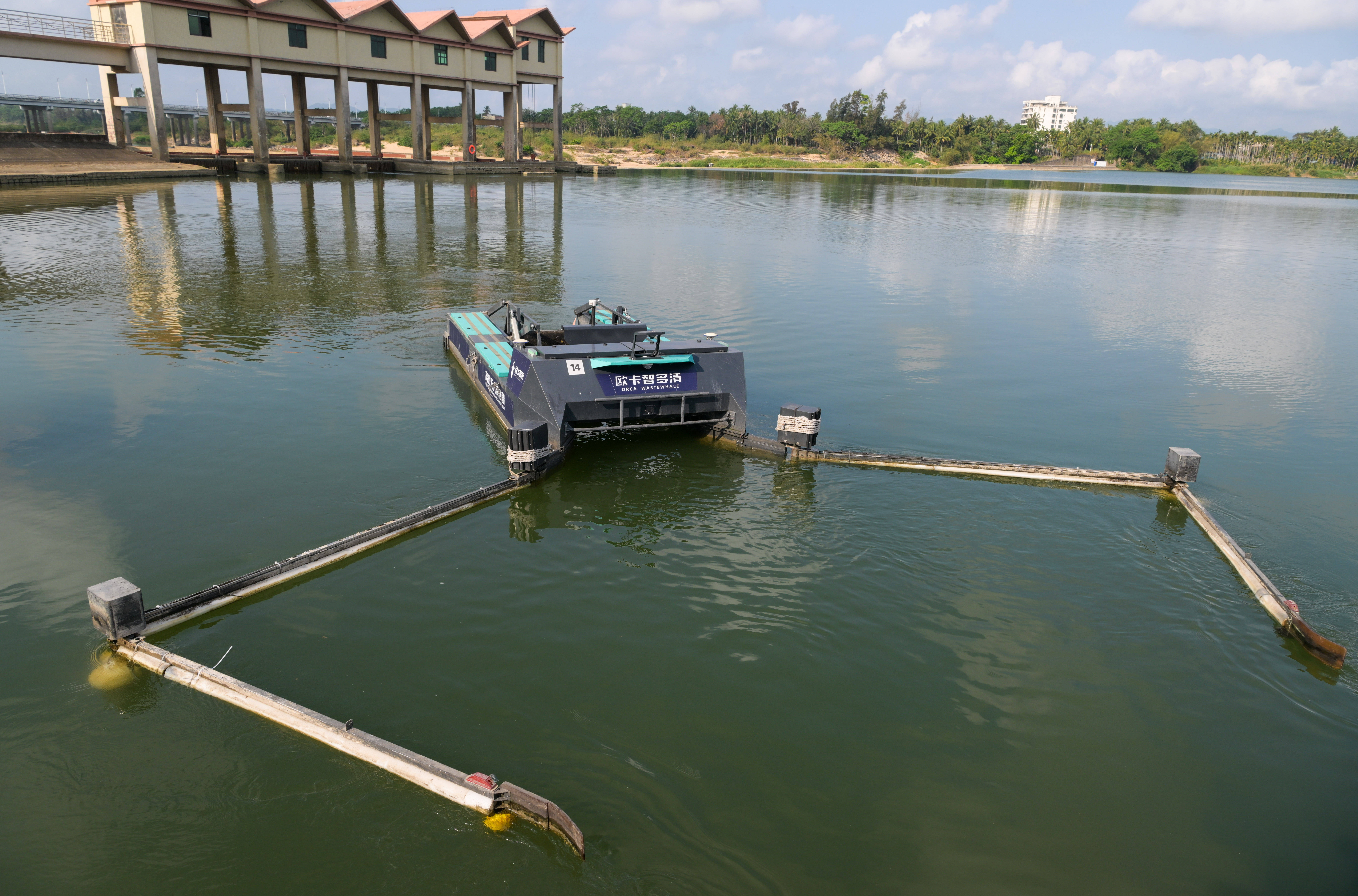 水上智慧环卫无人清(qing)洁船在万泉河水面作(zuo)业(3月25日摄(she))。 新华(hua)社(she)记(ji)者 刘莲芬(fen) 摄(she)