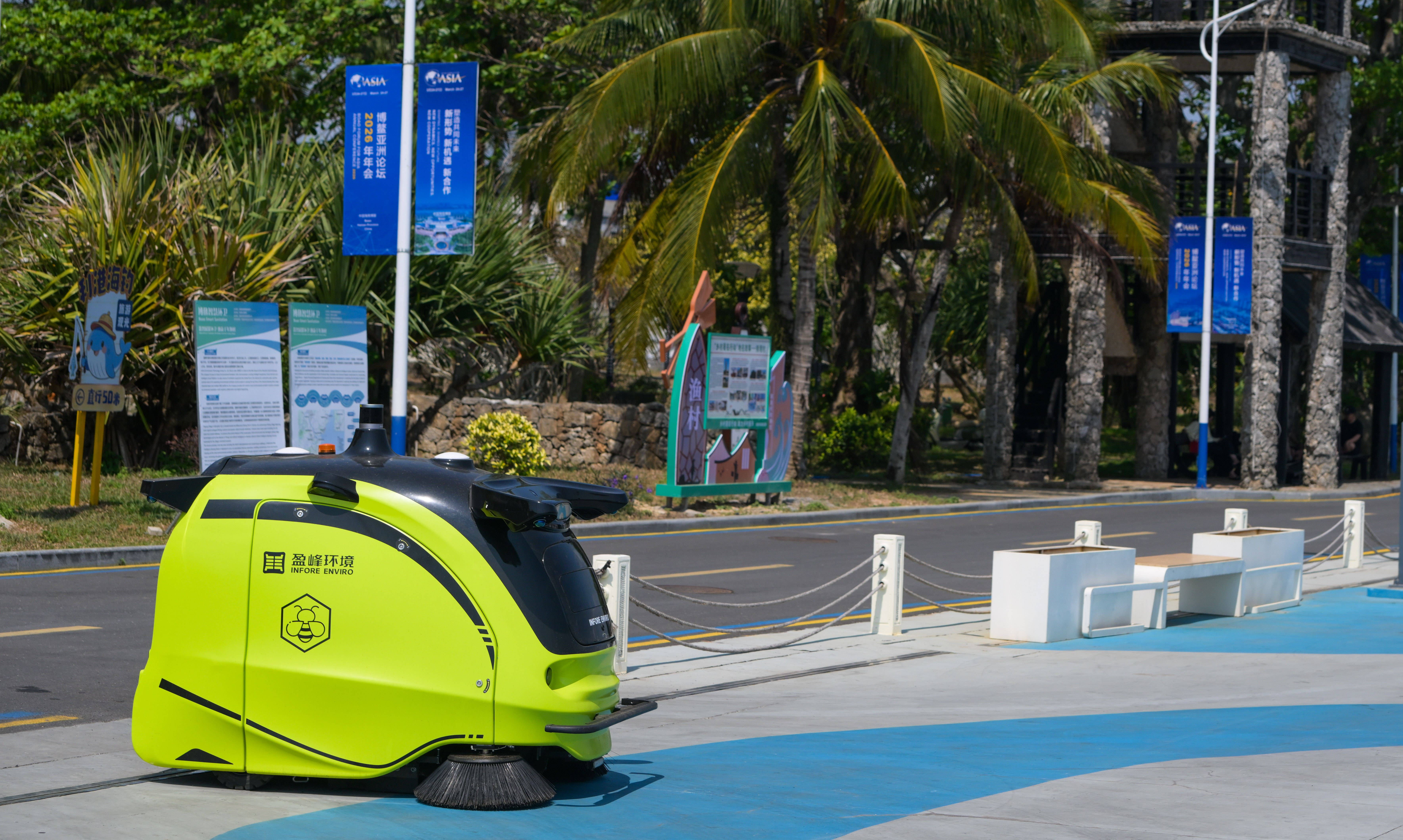 智能清(qing)扫机器人在海南(nan)省琼海市(shi)博鳌镇街头作(zuo)业(3月25日摄(she))。 新华(hua)社(she)记(ji)者 杨冠宇 摄(she)