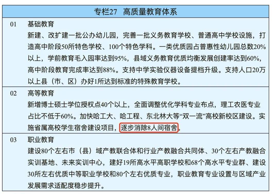 3月(yue)21日(ri),黑龙(long)江(jiang)省人民政府印发《黑龙(long)江(jiang)省国民经济和社会发展第(di)十五个五年规(gui)划纲(gang)要》。其中提到(dao):“实施省属高校学生宿(xiu)舍建(jian)设项目,逐步(bu)消除8人间宿(xiu)舍。”