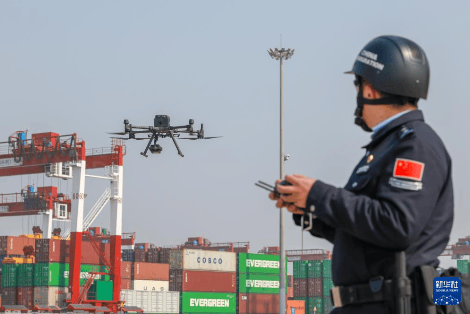 3月25日,执法职(zhi)员在装卸码头操控无人(ren)机巡(xun)查。新华社记者(zhe) 朱峥 摄