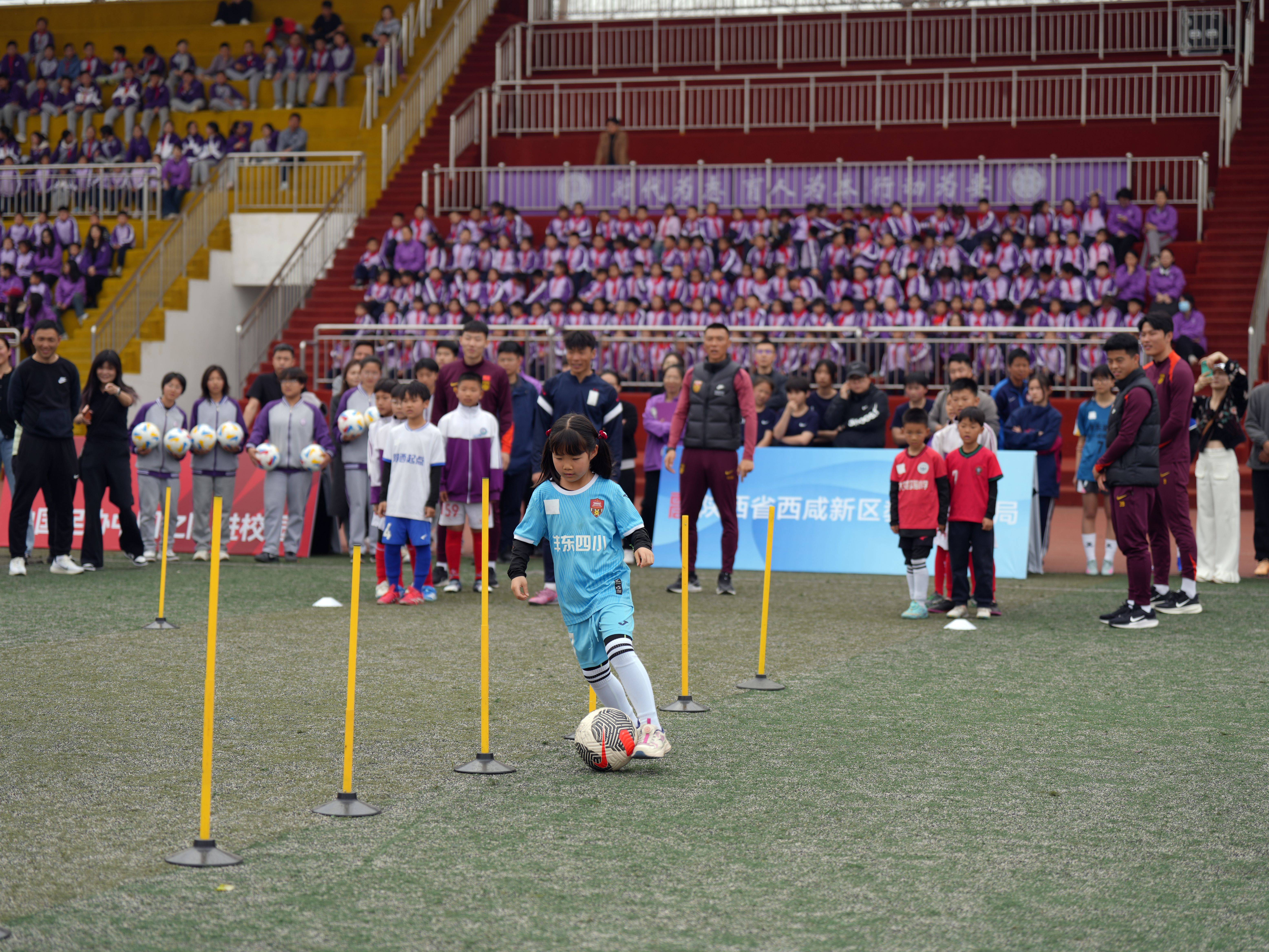 3月(yue)26日,球员(yuan)史松(song)宸(右一)在陕西西咸(xian)新区清华附(fu)中(zhong)秦汉黉舍指(zhi)导小球员(yuan)踢足球。 新华社(she)记者 赵英(ying)博 摄
