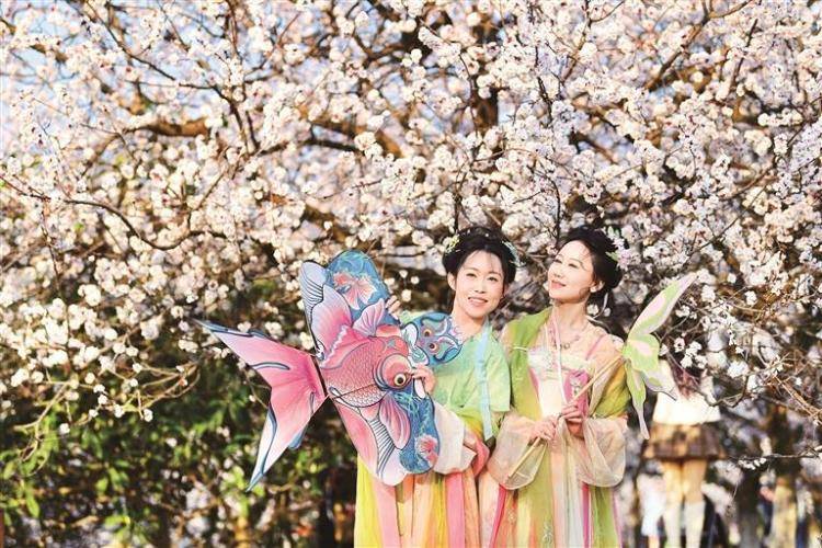 游人正在西安(an)大明宫国家遗址公(gong)园赏花留影。 新(xin)华社记者 邹竞一(yi) 摄