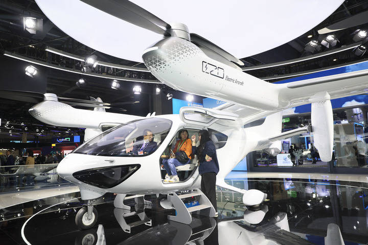 人(ren)们在第(di)八(ba)届进博会汽车及智慧出行展区时的科技展位体验电动垂直(zhi)起降遨游飞(fei)翔器(2025年11月8日摄)。(新华社)