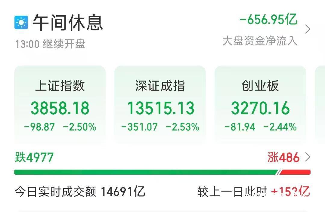 3月23日(ri),A股三(san)大指数早盘集体下跌(die),截(jie)至午盘,沪指报3858.18,跌(die)2.5%,深成指报13515.13,跌(die)2.53%,创(chuang)业板指报3270.16,跌(die)2.44%。全市半日(ri)成交额14691亿元,近5000只个股下跌(die)。