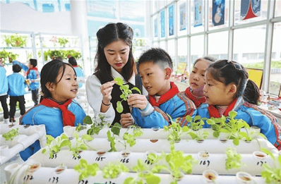 在湖北省襄(xiang)阳(yang)市大庆(qing)路小学“校园农场”,教师在给学生讲授(shou)水培育提拔(ba)物的(de)相干学问(wen)。材料图片