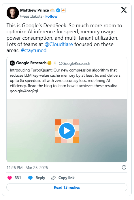 Cloudflare首席执行官Matthew Prince等人则将其称(cheng)为谷歌的“DeepSeek时候”,认为其无望像DeepSeek一样,通(tong)过极(ji)高的效率收益大幅拉低AI的运行成本。