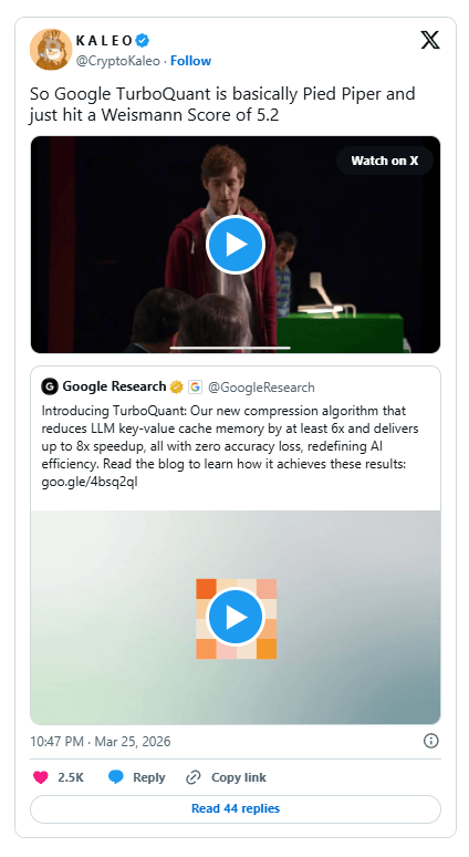 谷歌发(fa)布名为TurboQuant的内存压缩算(suan)法后,市(shi)场对存储(chu)硬件长期(qi)需求的担(dan)忧(you)迅速(su)蔓(man)延,致使(shi)相关(guan)资产遭(zao)到抛售。