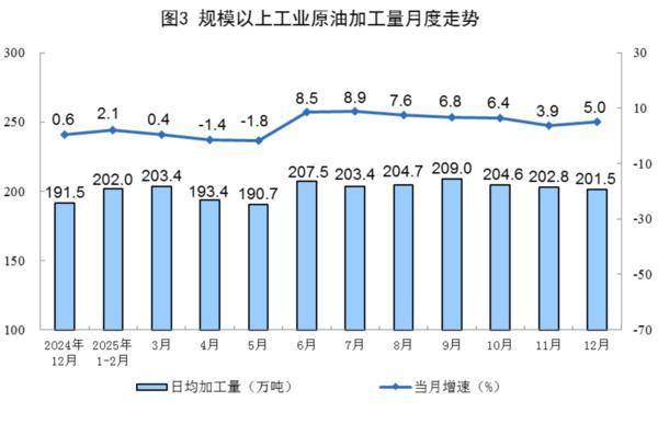 原油加工增速加速。12月份,规上产业原油加工量6246万吨,同比增进5.0%,增速比11月份加速1.1个百分点;日均加工量201.5万吨。