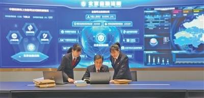 北(bei)京金(jin)融法院(yuan)法官(guan)丁宇翔(中)与法官(guan)助理在大数(shu)据中心研判跨境证券纠纷(fen)案件(jian)增长趋势及(ji)特点。 黄(huang) 硕摄