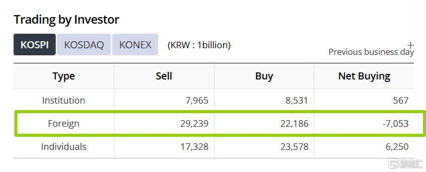 韩国交(jiao)易所(suo)数据显示,2月27日,正在本地机构及散户净买(mai)入的情况下,外资尾(wei)盘突袭,净卖出7万亿韩元(约48.6亿美圆)的韩国综合股价指数(Kospi)成分股,刷新(xin)史(shi)上单日净卖出纪录。