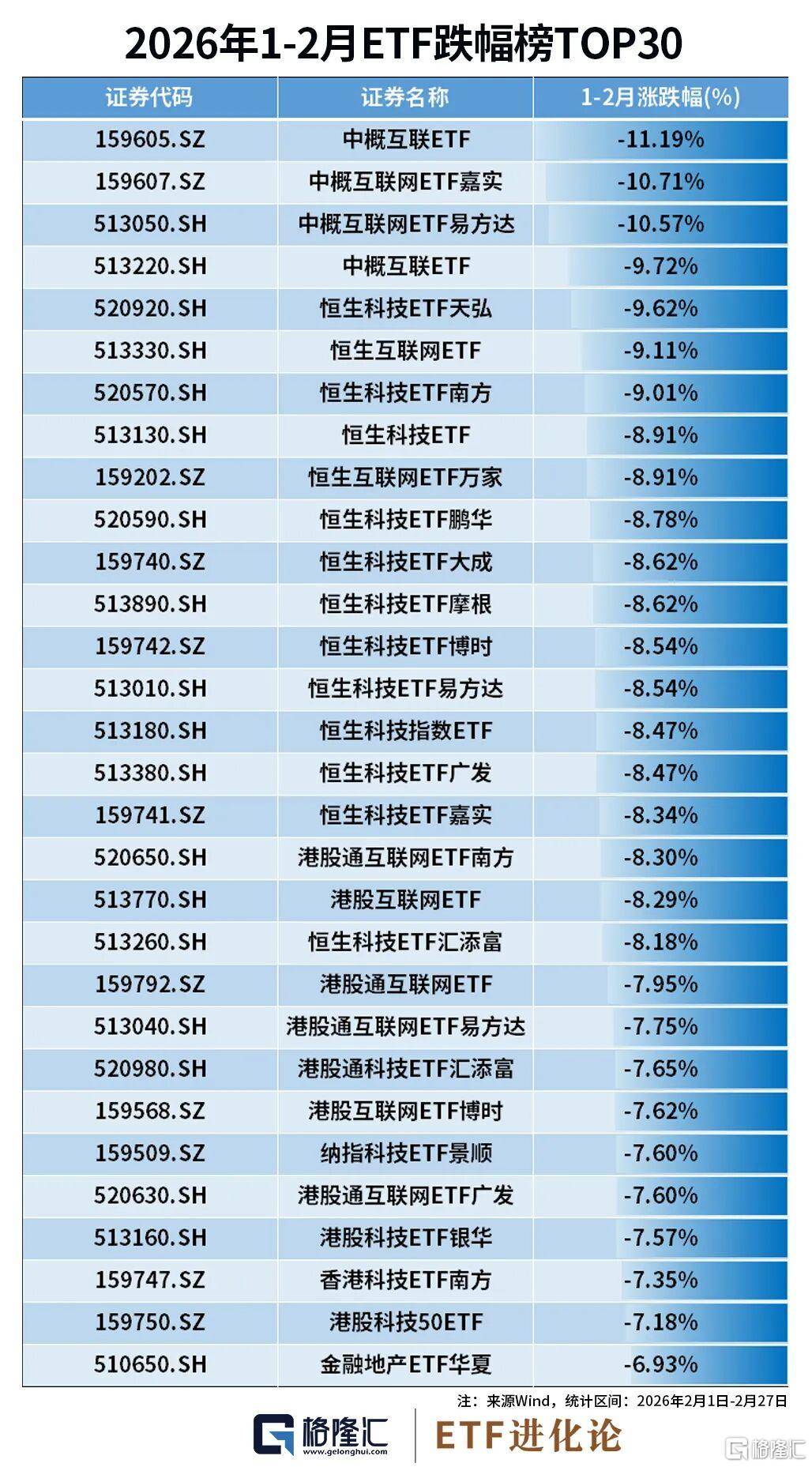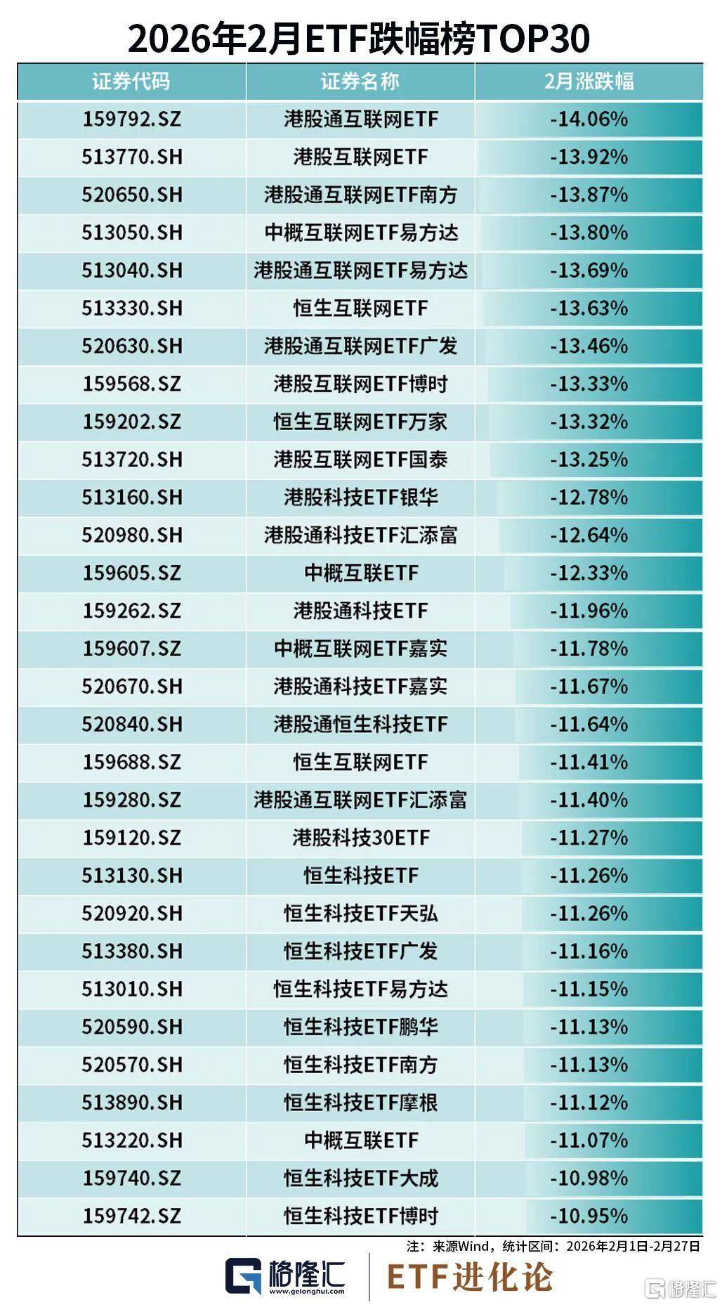 港股ETF全线下挫,港股通(tong)互联网ETF、港股互联网ETF月内分别跌14%和13.9%。