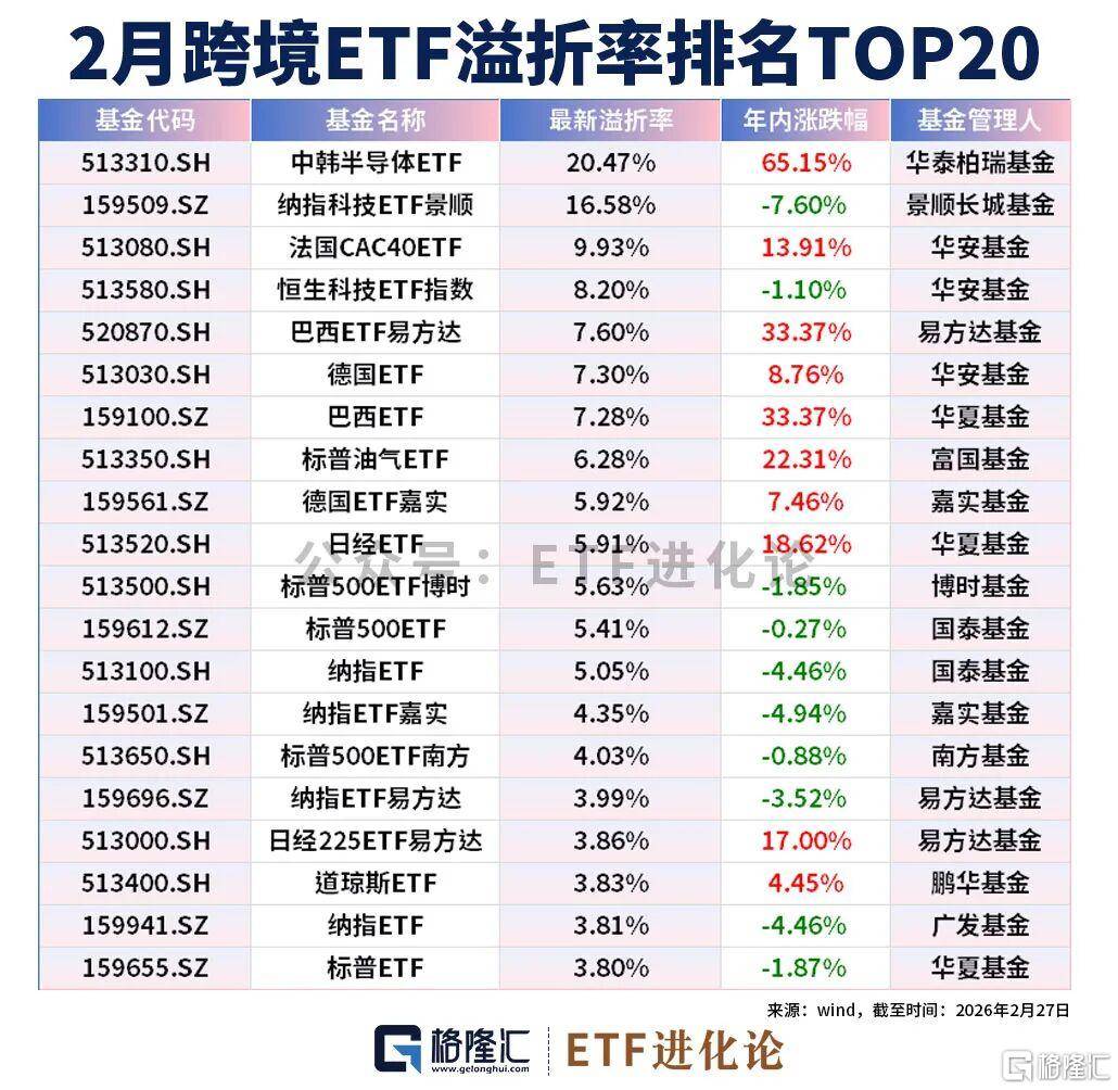 受此影响,昨日盘中涨4%的中韩半导体ETF(513310.SH)最终跳水下跌1%,最新(xin)溢折率仍高居20.47%峰位,跻身跨境ETF第一(yi)。