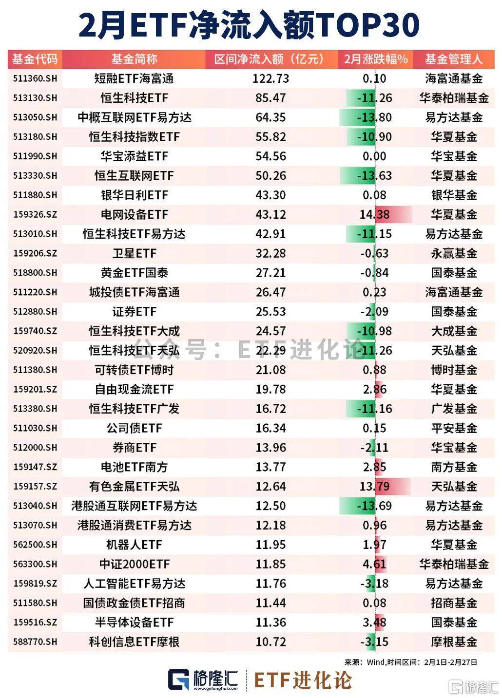 恒生科(ke)技ETF(513130.SH)、中概互联网ETF易方(fang)达(513050.SH)和恒生科(ke)技指数ETF(513180.SH)分别净流入85.47亿元、64.35亿元、55.82亿元。