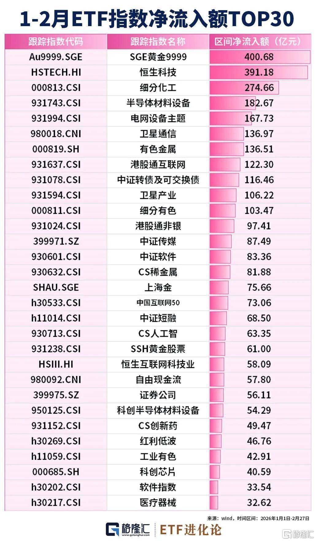 如电网设备ETF年内净流入167.73亿元,居全ETF市场(chang)第一(yi),化工ETF(159870.SZ)、卫星ETF(159206.SZ)、黄金ETF(518880.SH)和有色金属ETF(512400.SH)均“吸金”超百亿。