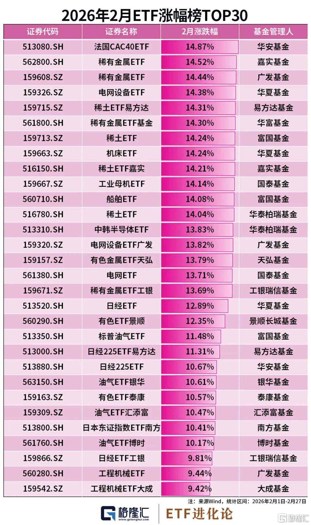 2月涨幅(fu)第一(yi)的ETF是法(fa)国CAC40ETF(513080.SH),期内上涨14.87%。