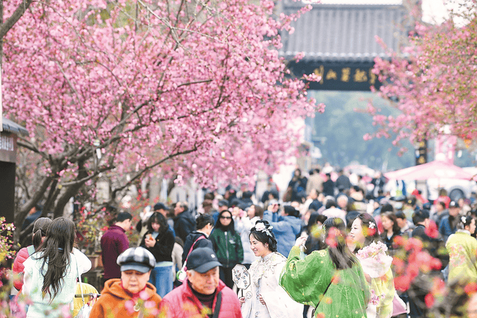 3月20日,第四十三(san)届莫愁湖海棠(tang)花会在南京市莫愁湖公园抱月楼广(guang)场启幕。本届花会以“海棠(tang)映金陵 乐动莫愁春”为主题(ti),将(jiang)持(chi)续至5月10日。园内垂(chui)丝海棠(tang)柔(rou)枝低垂(chui),粉白花瓣缀满枝头;贴(tie)梗海棠(tang)艳而不俗,簇簇繁花与碧波春水、青瓦飞檐相(xiang)映成趣。游人循香漫步,处(chu)处(chu)皆是“人在花中(zhong)走,景随脚步移”的(de)诗意画卷。新(xin)华日报 记者 邵丹 摄